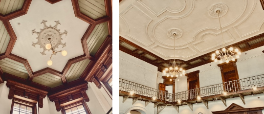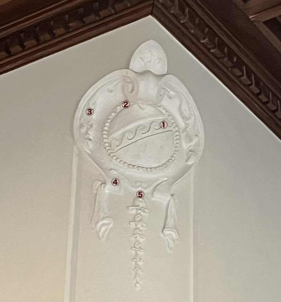 2階の壁には、漆喰しっくいで形どられた装飾そうしょくがあります。