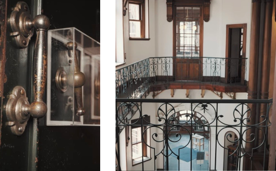 よく見れば、手すりやドアノブなど、細部の金属はった作りの和の様式。