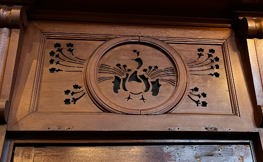 扉の上部は「孔雀くじゃく文様」の透かし彫り。